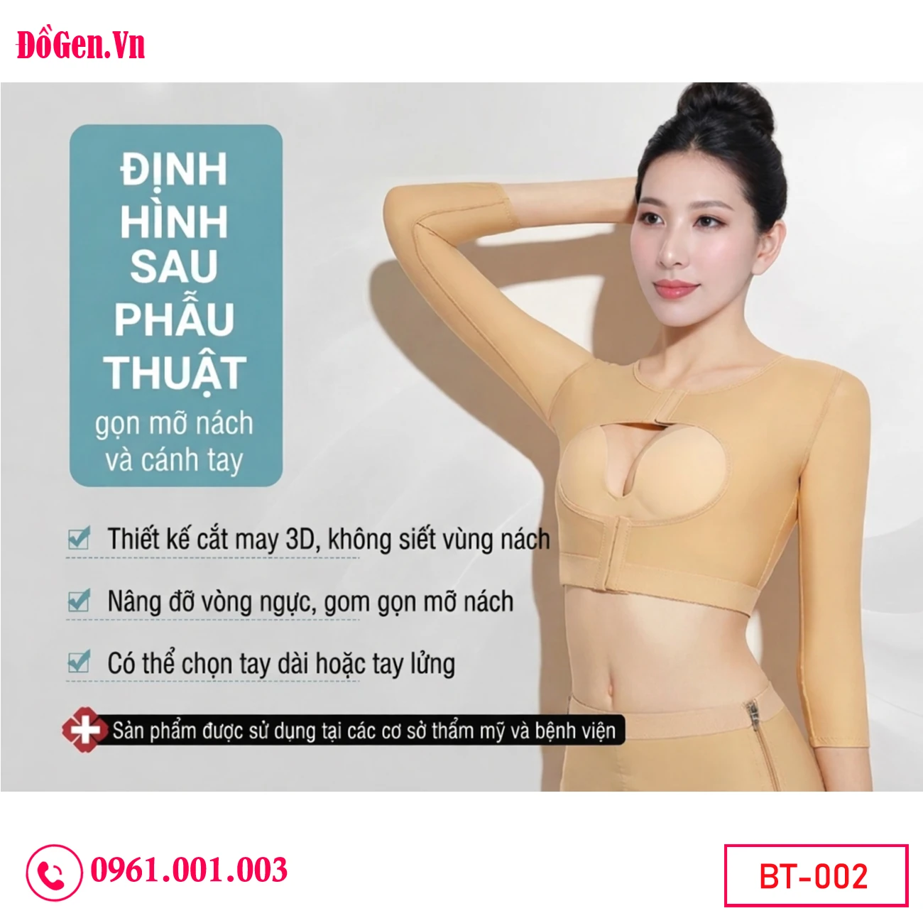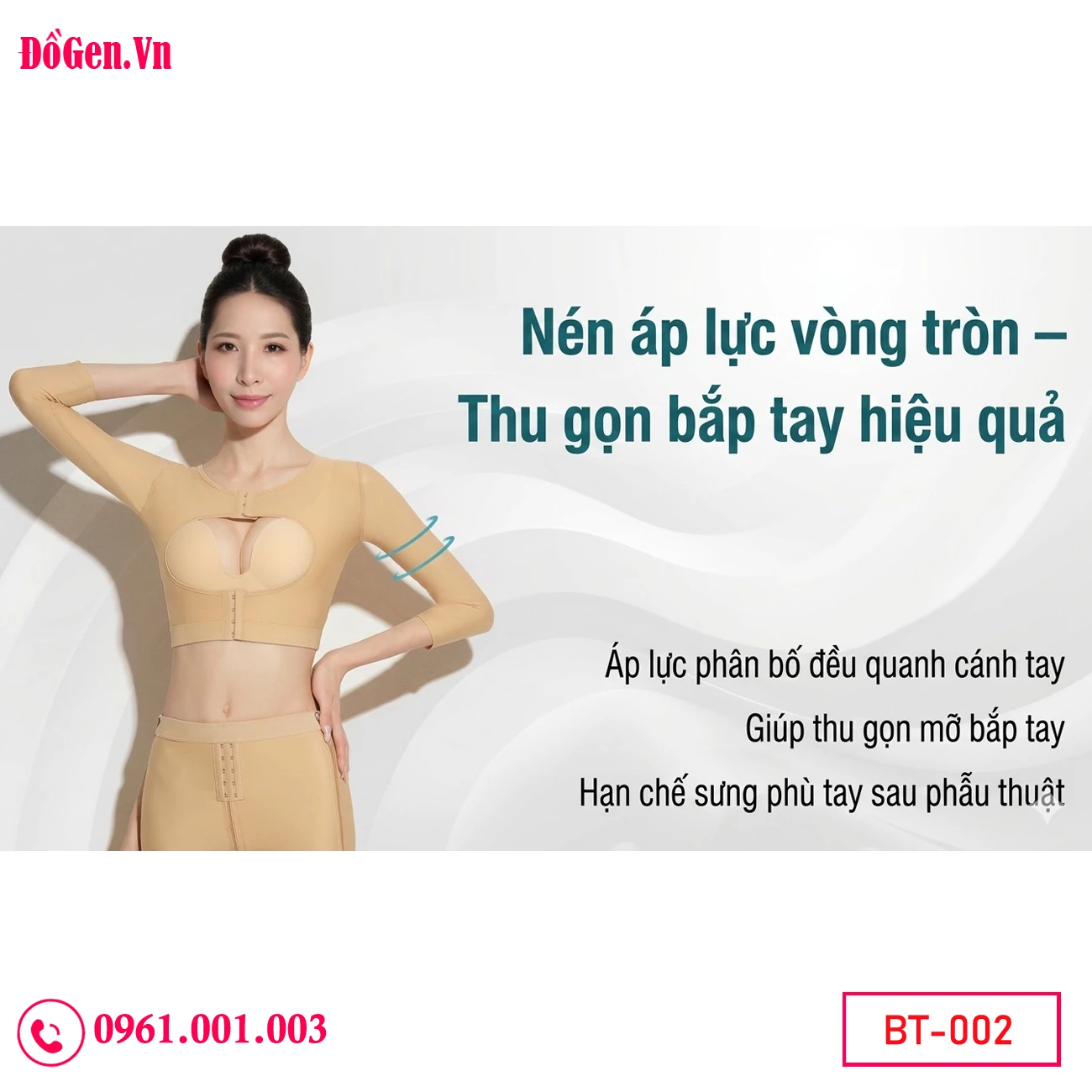 Áo gen định hình bắp tay BT-002 tại ĐồGen.Vn được thiết kế chuyên biệt cho chị em hậu phẫu. Sản phẩm không chỉ siết gọn cánh tay mà còn hỗ trợ gom mỡ nách, phẳng lưng, tạo nên diện mạo thanh thoát toàn diện từ vai xuống eo.