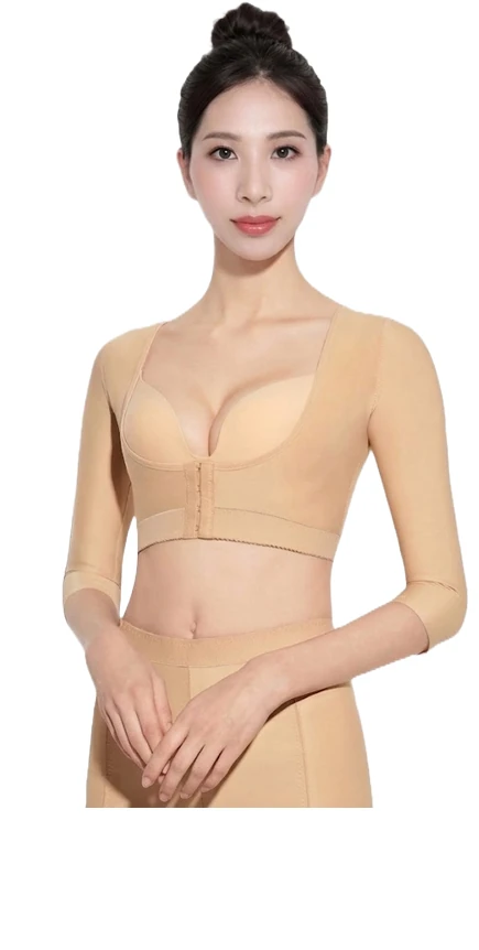 woman wearing arm compression garment after liposuction, clean background