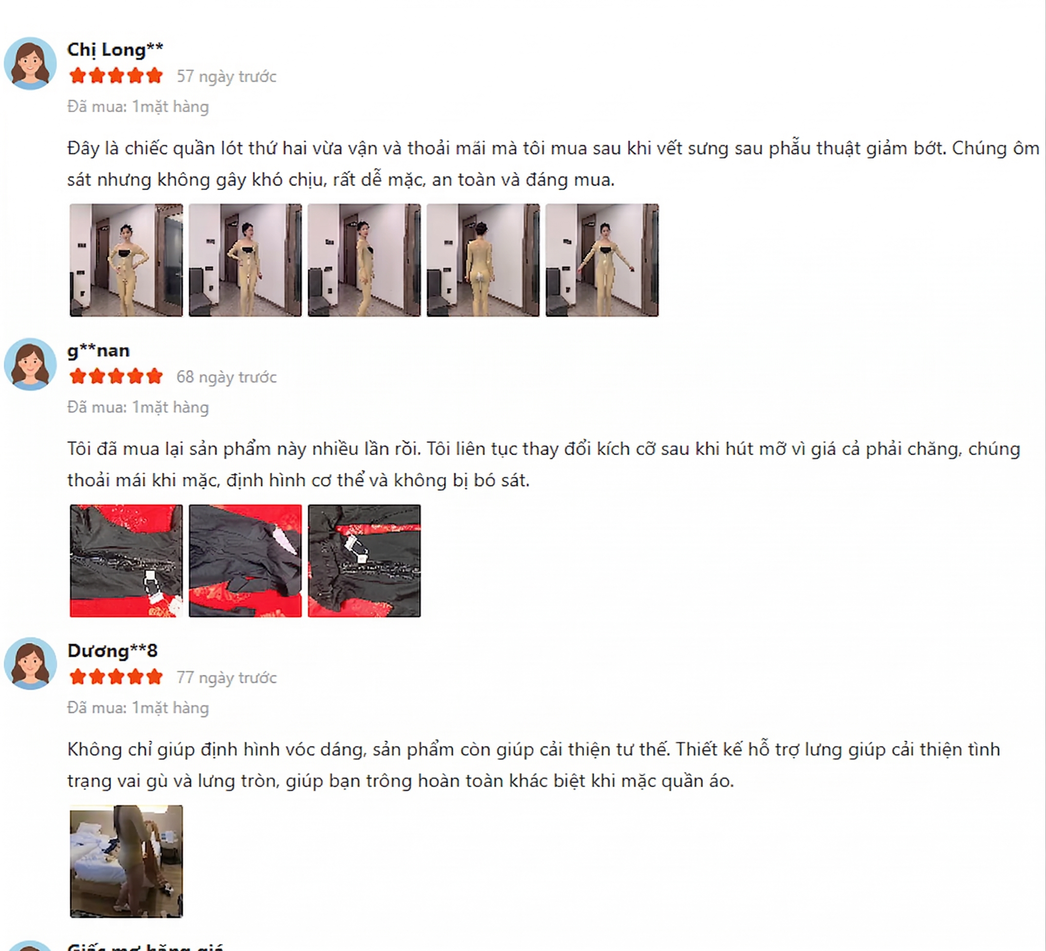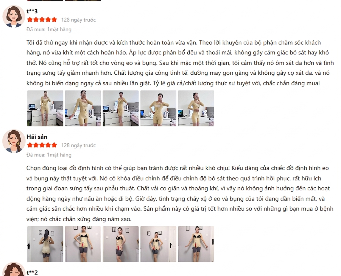 "Chất vải cực kỳ êm. Lúc mới mua sợ mặc nguyên ngày sẽ bị ngứa và bí bách vết thương, nhưng loại này thông thoáng lắm, dịch tứa ra cũng không bị hôi. Form ôm sát mỡ lưng nách nên mặc đầm body ra ngoài không ai biết mình đang mặc đồ gen." - Chị Ngọc Yến (28 tuổi, Hà Nội)