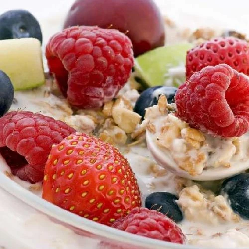 Nguyên liệu: 3 thìa bột yến mạch, 1 thìa bột đậu (đậu nành hoặc đậu xanh, đậu đen), 1 hộp sữa chua không đường, 2-3 loại trái cây tươi như chuối, táo, bưởi... thêm ít hạt nho khô hoặc táo khô.