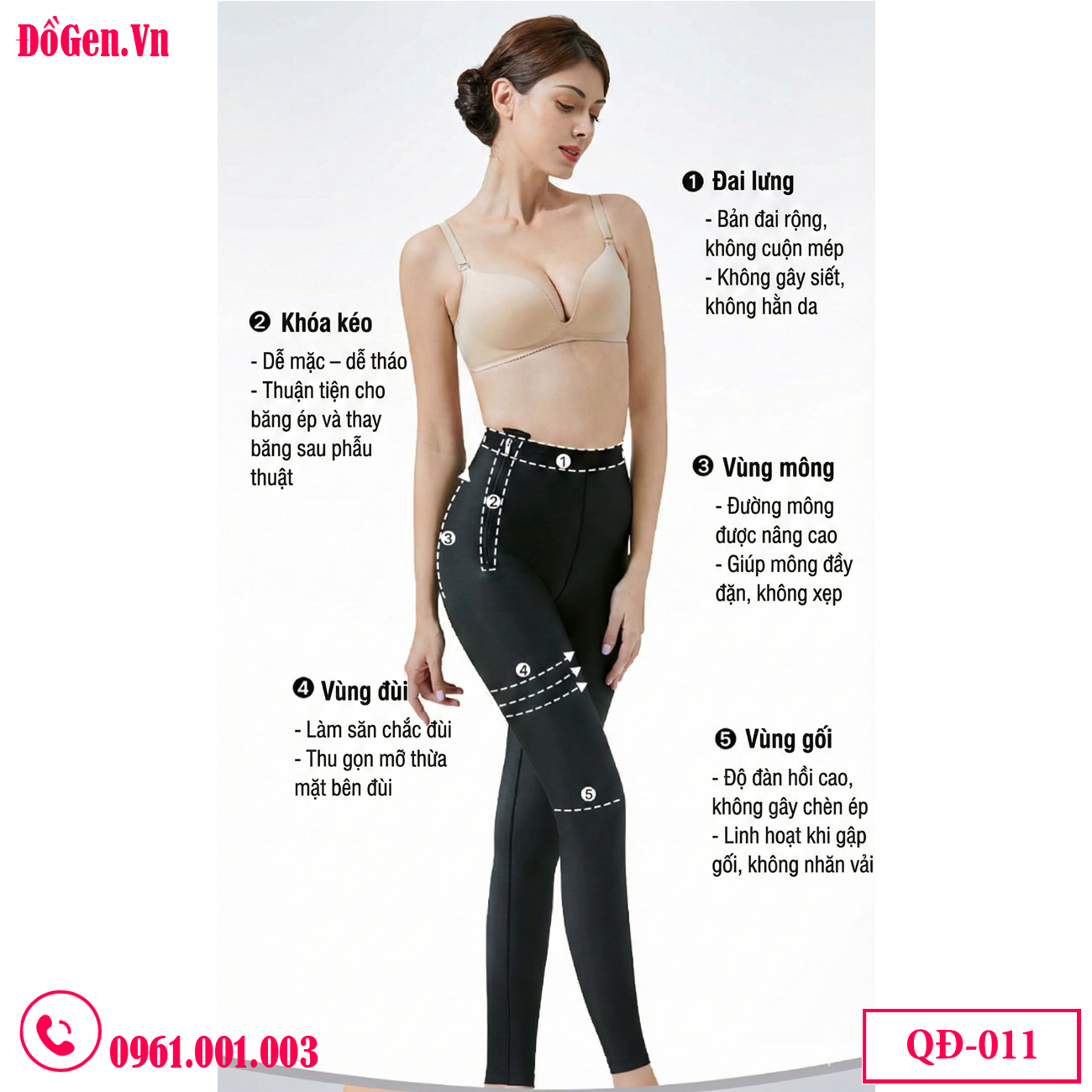 - Quần gen định hình QĐ-011 được phát triển để đáp ứng nhu cầu của nhóm khách hàng cao cấp — những người mong muốn kết quả thẩm mỹ tối ưu, phục hồi an toàn và trải nghiệm thoải mái trong suốt quá trình hậu phẫu.